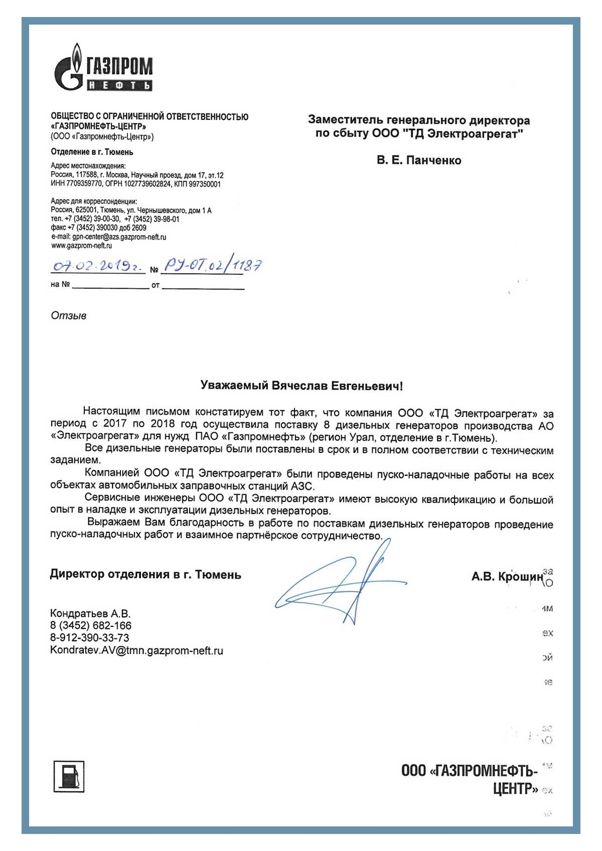 Отзыв контрагентов о компании ООО «ТД Электроагрегат» и  исполненном проекте для ООО «Газпромнефть-Центр»