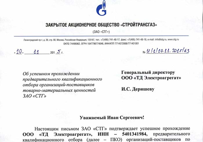 Письмо ЗАО «Стройтрансгаз» о прохождении «ТД Электроагрегат» квалификационного отбора